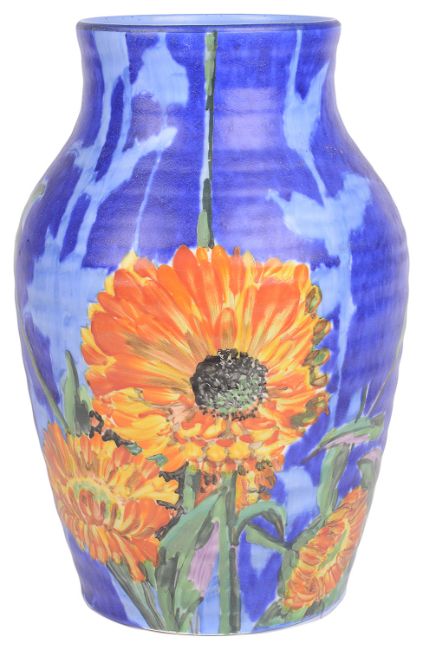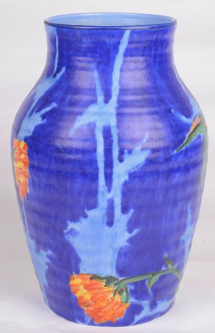 the baluster shape with ribbed body, with royal blue ground with light blue foliage and colourful marigold flowers, factory mark to base, with impressed number 1818.