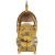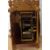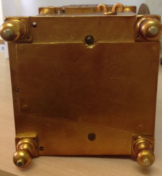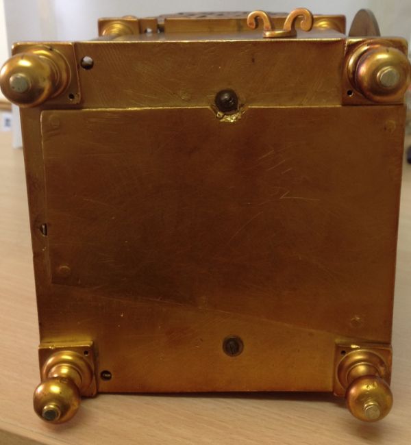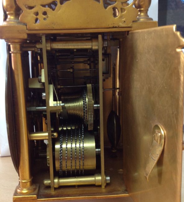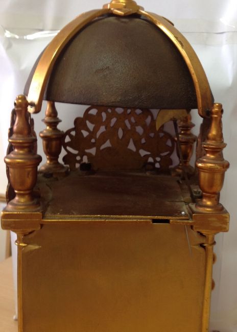the knopped finial above a domed bell, with pierced fretwork panels over the Roman numeral chapter ring with dial centre engraved with flowers, pierced hands, raised upon bun supports, with doors at each side, with key.