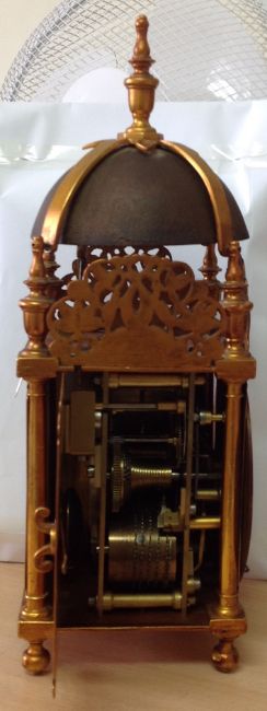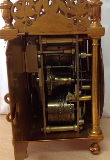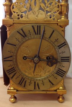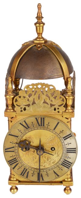An English brass lantern clock with two train fusee and chain movement striking on a top mounted bell, early 20th century