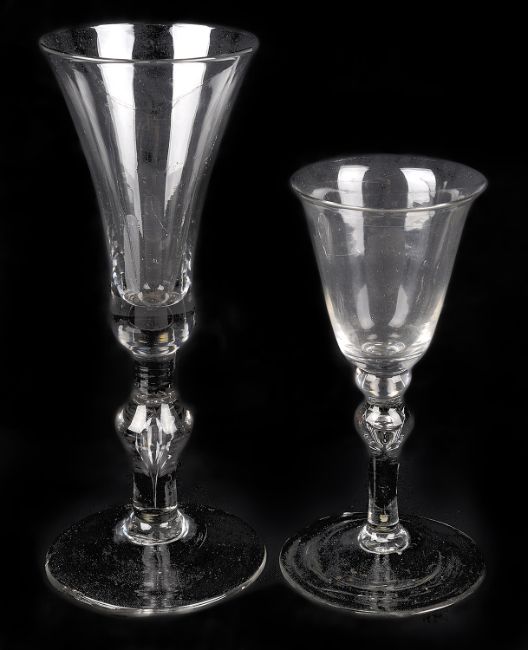the bell bowl with shoulder knop stem above a tiered inverted baluster on a conical foot, together with a larger baluster stem wine glass with slender bell bowl on a central inverted baluster tiered stem and conical foot (2)