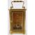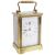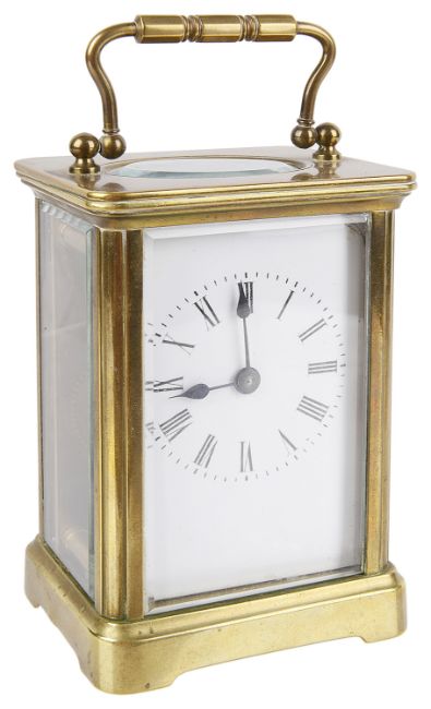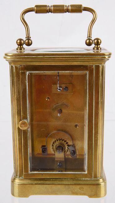 of rectangular form with white dial, Roman hours and spade hands, the swing handle on the top above glass panels, with brass columns upon a plinth base, with key.