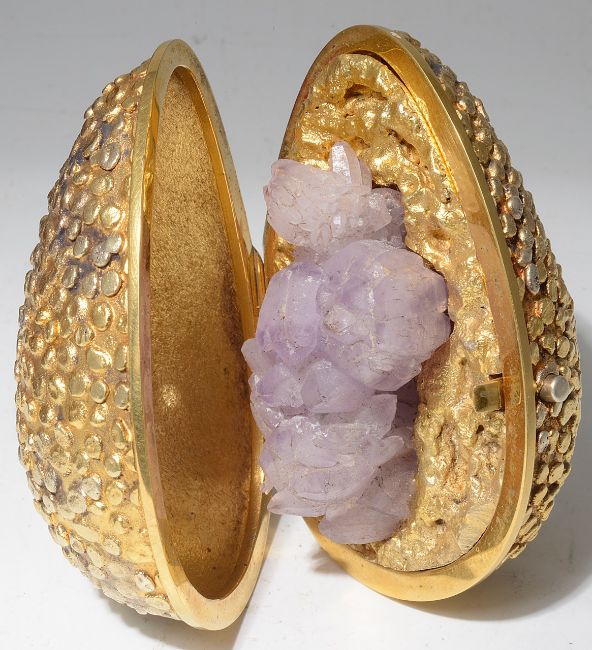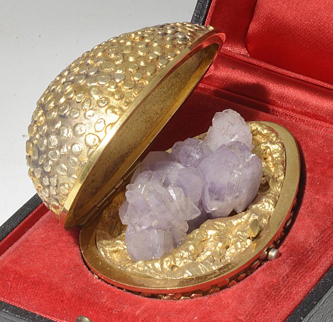 of ovoid form with dimpled textured body, the hinged opening to reveal a amethyst crystal embedded silver-gilt ground, in original fitted case.