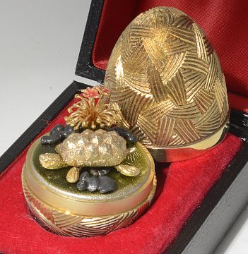 of ovoid form with linear textured body, opening to reveal a trembling tortoise flanked by rock and enamelled flowers, on a olive green ground, No. 132, in original fitted case.