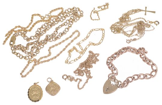 A 9ct rose gold curb link bracelet and other mainly 9ct gold chains