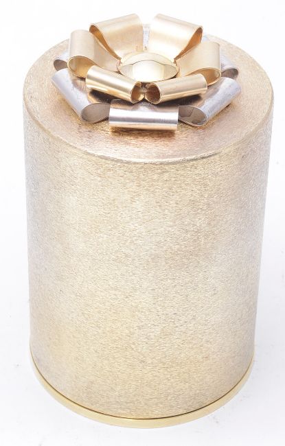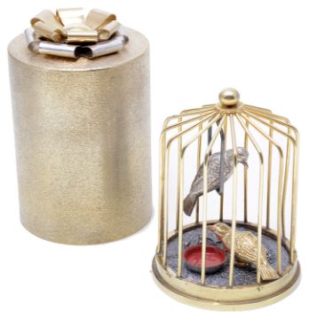 the cylindrical ribbon mounted box, opening to reveal a gilt bird cage enclosing a dove beside a red water bowl and another seated on a swing, numbered 39 of 100.