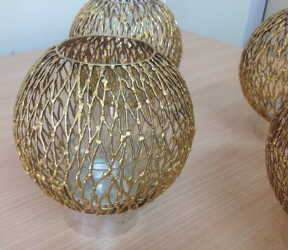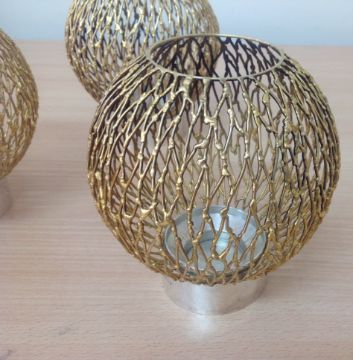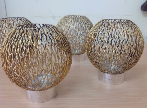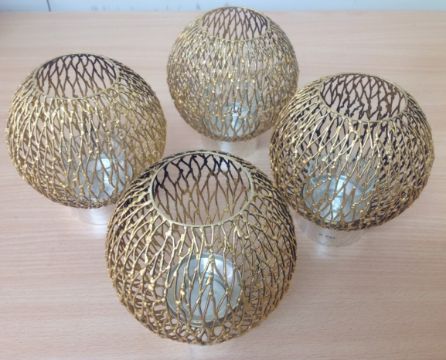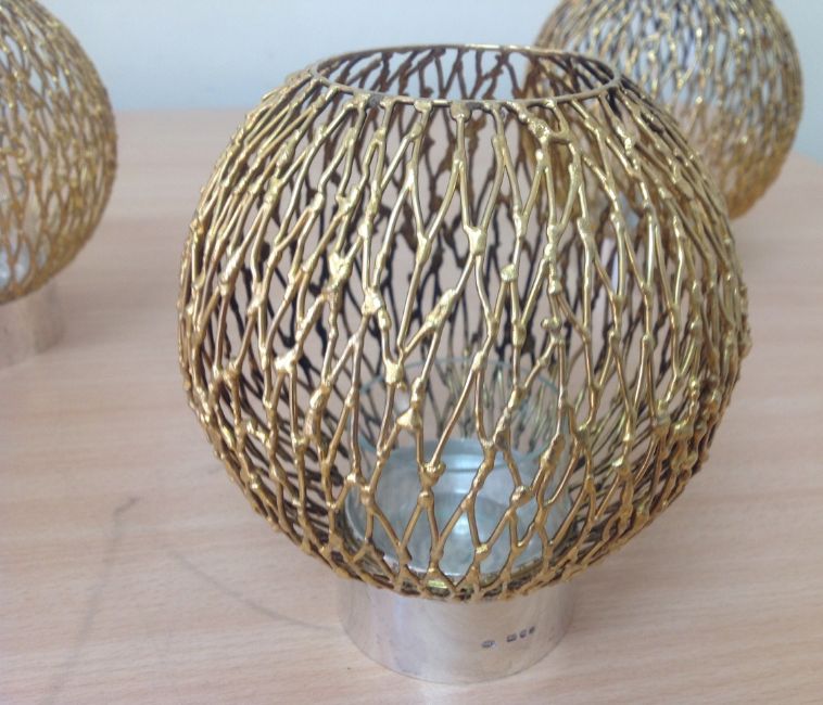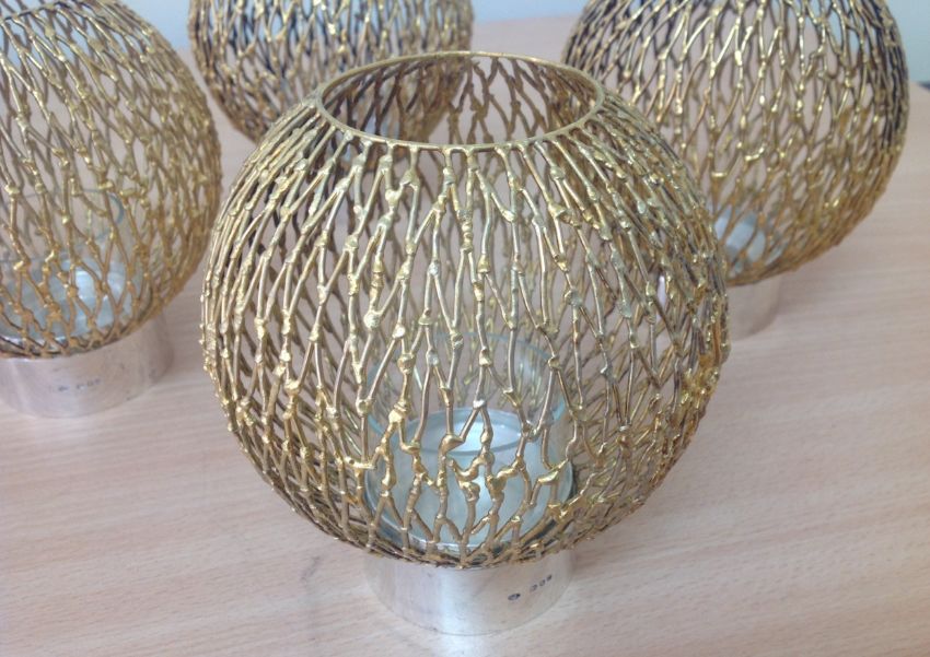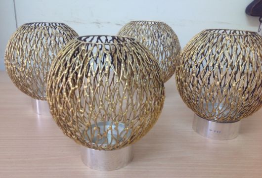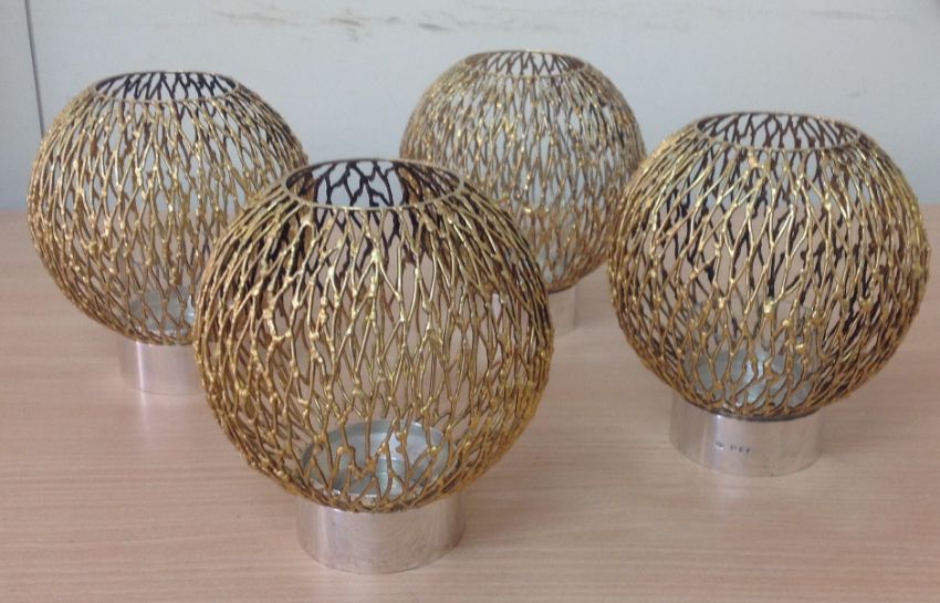 the polished circular holders with three glass liners and four detachable pierced wirework spherical shades, (4).