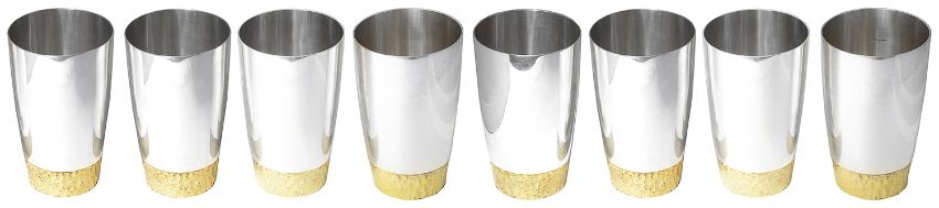 Stuart Leslie Devlin AO CMG (Australian, 1931 - 2018) A set of eight parcel-gilt silver beakers, hallmarked London 1972 of tapering cylindrical form with polished body and textured lower section, each numbered to underside, (8). weight: 66ozt; height: 11.4cm approx. Condition: Fair to good, with little wear to each, some wear to gilding on base of one beaker.