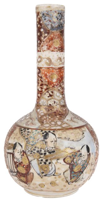 the spherical body enamelled and gilded to each side with a figural panel within trellis and geometric panels, the extended cylindrical neck with similar decoration