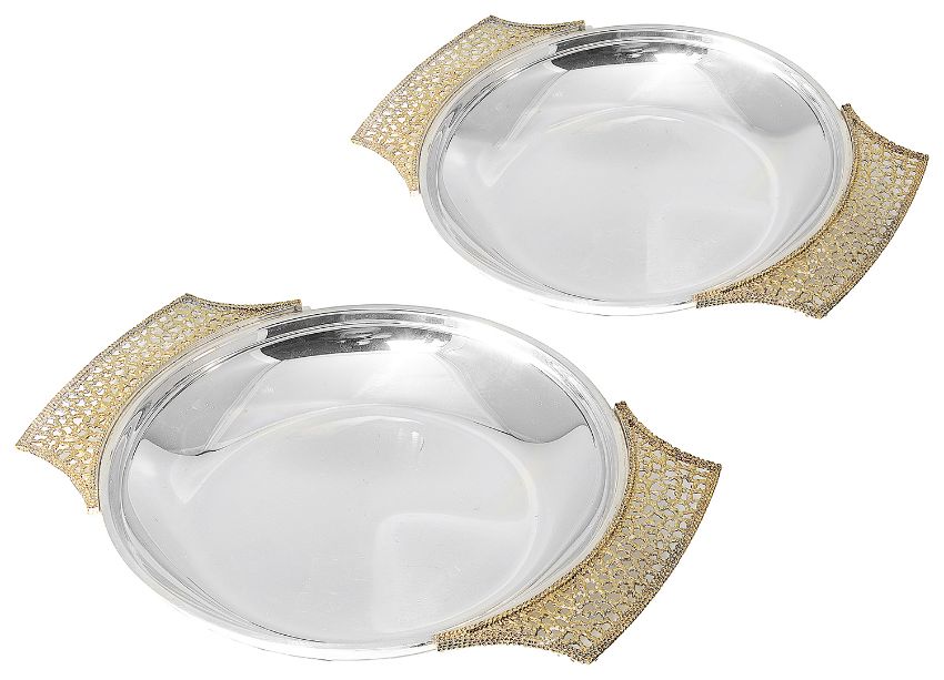 both of circular form with two pierced wirework textured handles, (2).