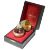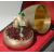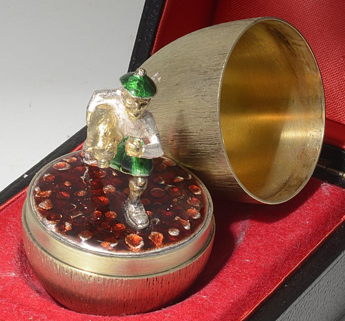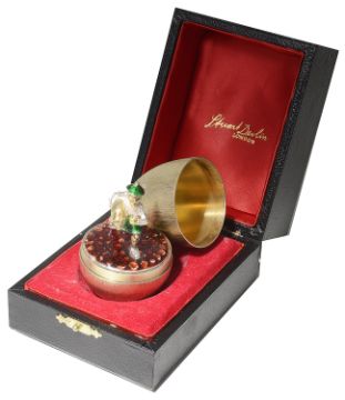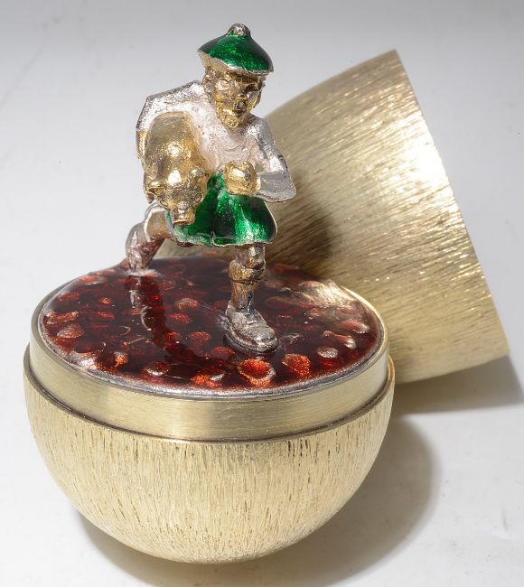 of ovoid form with textured body, opening to reveal a boy running with a pig under his arm, wearing a green enamelled hat and kilt, on a red marbleised ground, No. 106, in original fitted case.