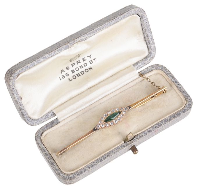 the centre set with a marquis shaped emerald paste within a rose diamond cluster, yellow metal mount tests for gold, associated Asprey brooch box