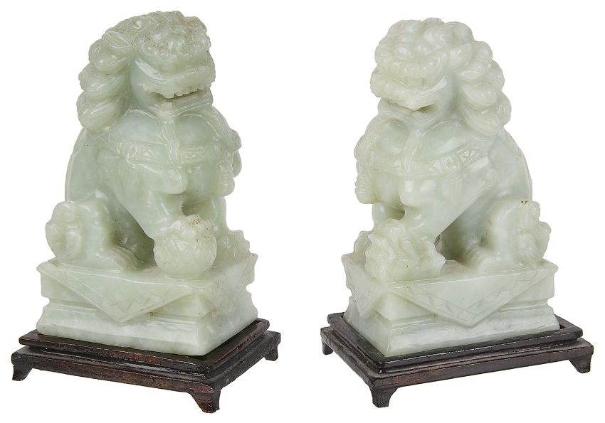 A pair of Chinese green hardstone carved Buddhistic lions, mid 20th century,