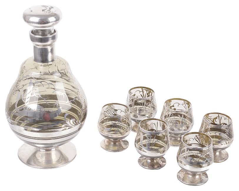 A Bohemian silvered glass decanter with six matching glasses, mid 20th century