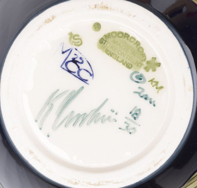 the baluster tubelined body with otters at play amongst bull rush on a navy ground, impressed and painted factory mark to base, with Kerry Goodwin signature in green, Limited Edition 18 of 30, Moorcroft Collectors Club logo, in original box with cardboard sleeve.
