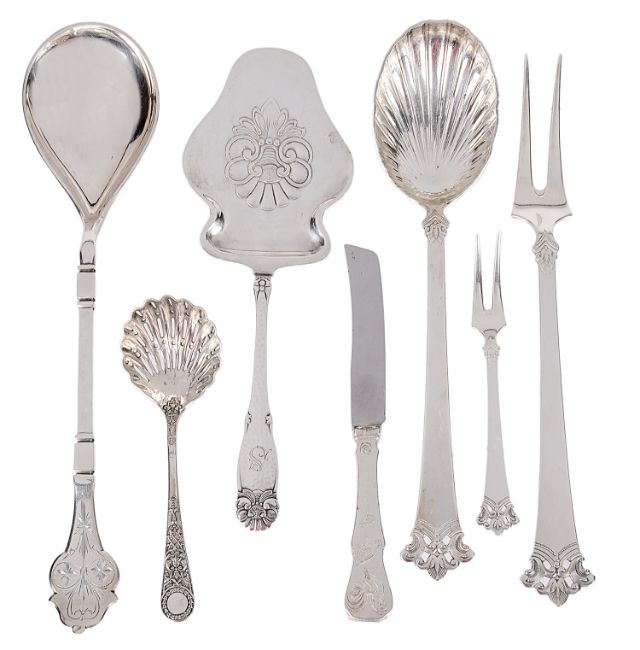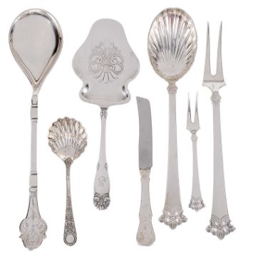 a silver serving spoon and fork by Magnus Aase, Bergen, with pierced c-scroll decorated terminal, each stamped 830S; a silver serving spoon by Kristian M Hestenes, Bergen, with engraved terminal, stamped 830S; a silver pickle fork by Magnus Aase, Bergen, stamped 830S; a silver cake slice, stamped 830S; a butter knife, stamped 830S and a silver-plated sifter, (7).