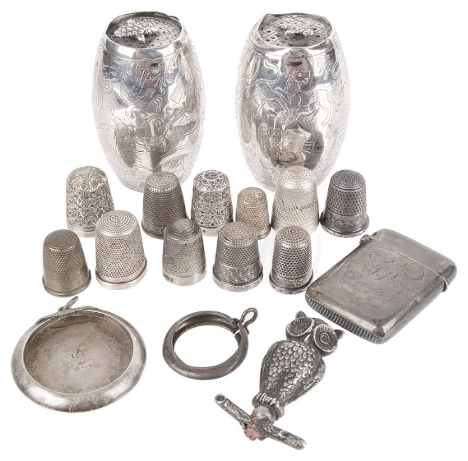 comprising a George V Charles Horner silver thimble, hallmarked Chester 1913, together with five further silver thimbles, hallmarked Birmingham 1901 & 1929 by Henry Griffith & Sons, Birmingham 1918 by James Fenton & Co, Birmingham 1900 by Henry Griffiths & Sons Ltd, Birmingham 1924 by James Fenton & Co; five metal thimbles; a silver vesta case, hallmarked Birmingham 1876 by James Cook & Son; a silver pendant case hallmarked Birmingham 1919, damaged; two white metal pounce pots, in the form of barrels engraved with animals and a white metal owl, (qty).