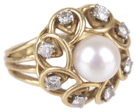 An 18ct gold mounted cultured pearl and diamond set fancy ring
