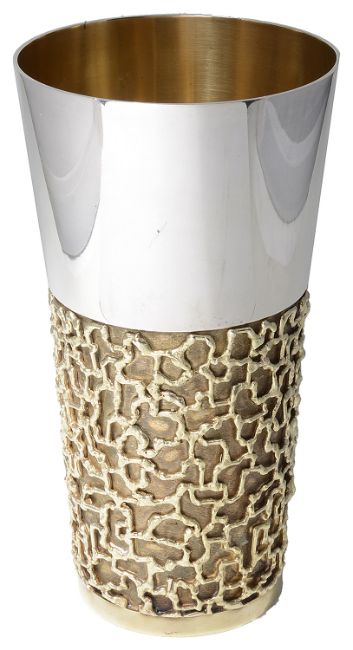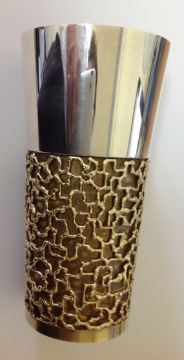 of tapering cylindrical form with polished silver upper section of parcel-gilt textured wirework lower section.