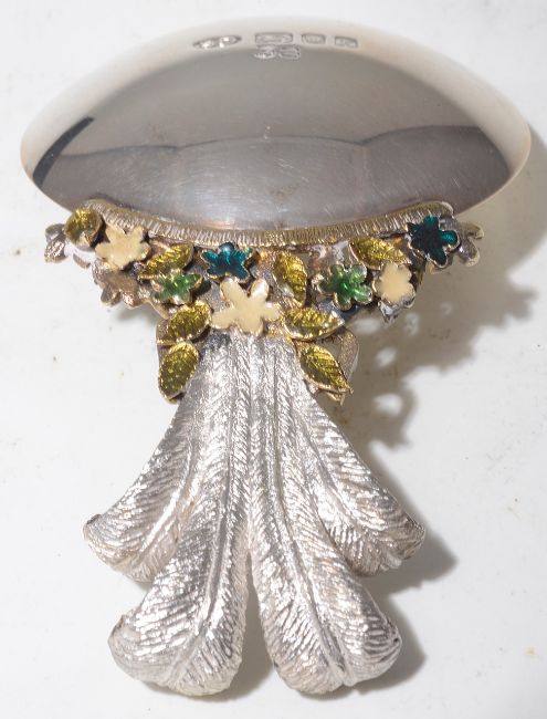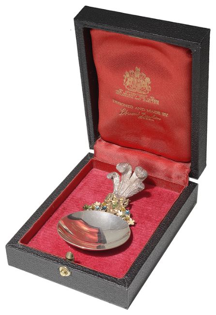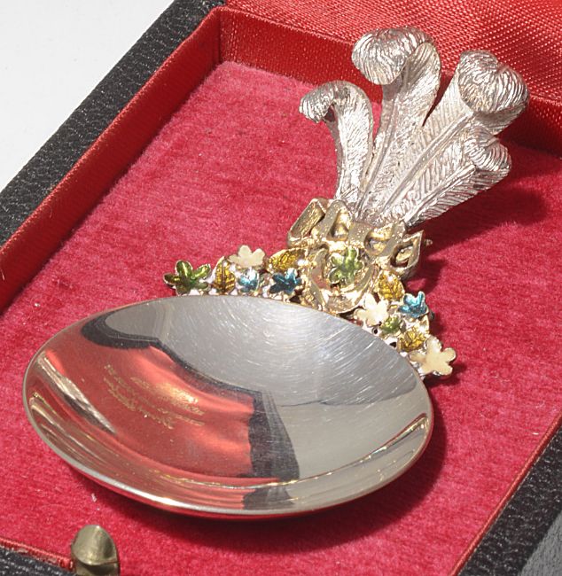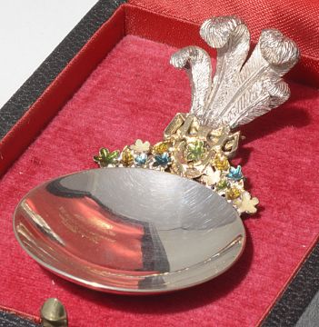the circular bowl with the handle of Prince of Wales feather surmounting cream and blue enamelled flowers, No.38, in original case.