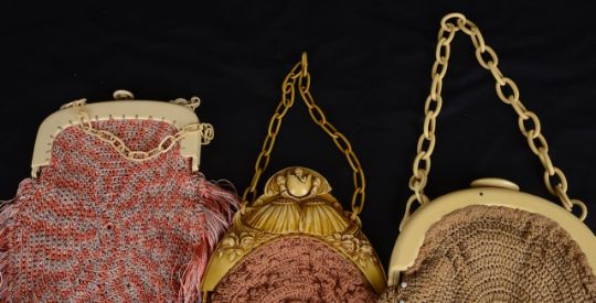 A French Art Deco crocheted evening bag with celluloid mounts, the clasp decorated with two girls holding a large egg from which is emerging a putto, beneath the chain clasp, together with two other similar crocheted evening bags with faux ivory celluloid clasps and chain handles, one with elaborate fringe detail, (3)