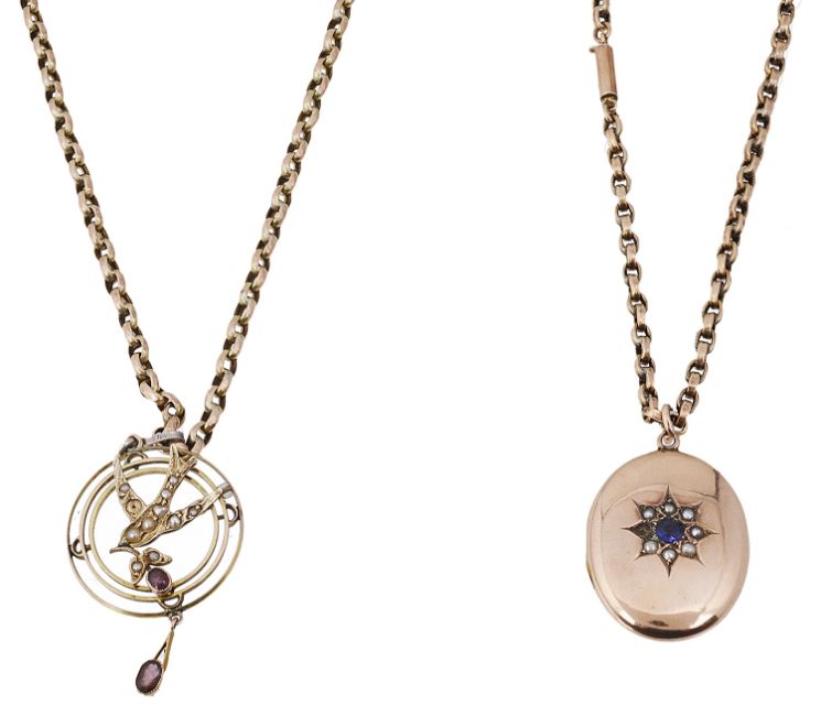 the yellow metal hinged locket testing for gold, the locket suspended from a 9ct gold belcher chain, together with an Edwardian seed pearl and garnet drop 'swallow' circular pendant, suspended from an earlier 9ct gold belcher chain, (2)