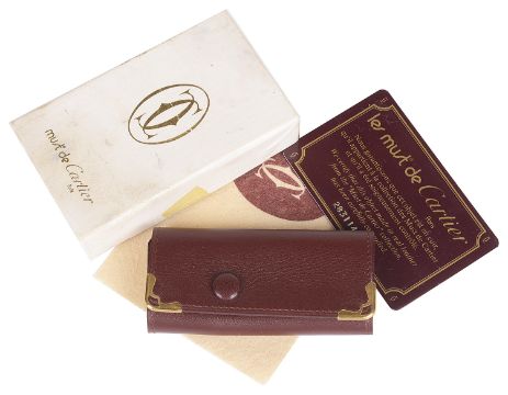 the burgundy leather case with press stud and gilt metal corners, opening to reveal four gilt metal key holders, stamped Cartier Paris, together with les Must de Cartier certificate card and felt cloth, in original box.