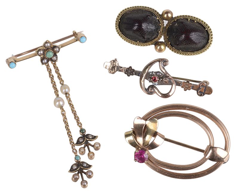 stamped 15ct and maker's initials S.S? to reverse, together with a Victorian double scarab beetle mounted brooch, part tests gold, a later two coloured metal ruby set cocktail brooch, tests for gold and a 'witches heart' 9ct gold bar brooch (4)