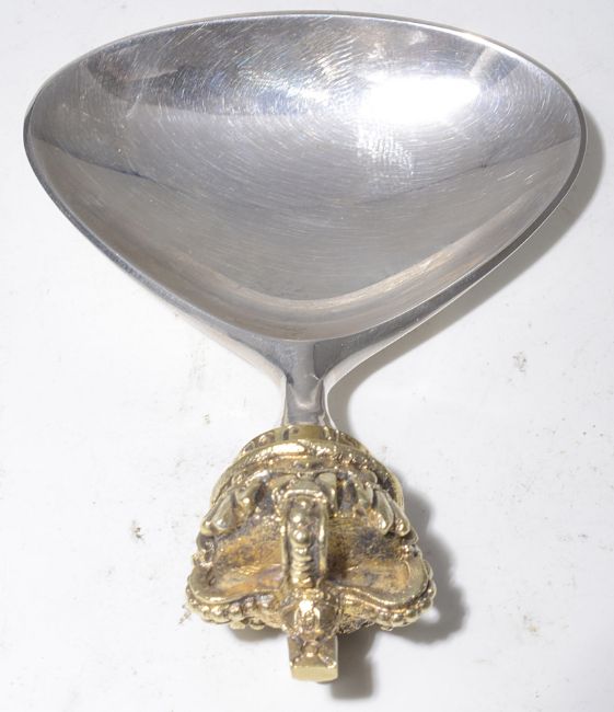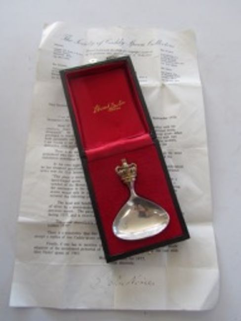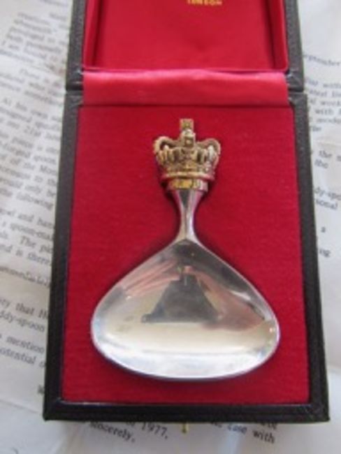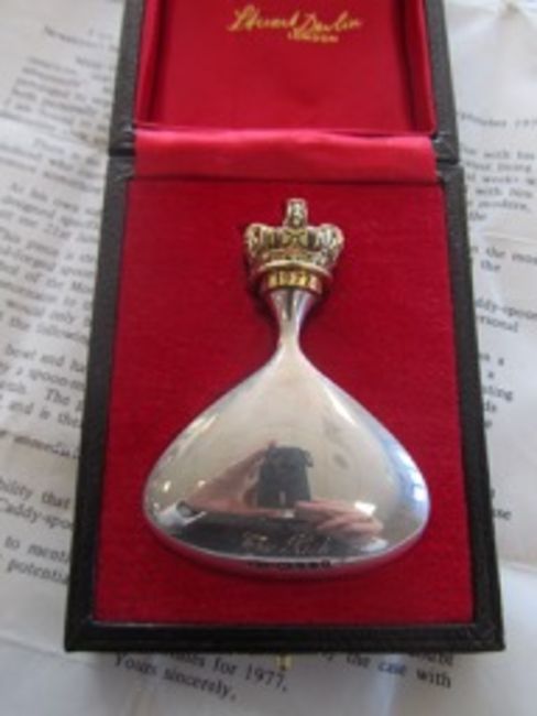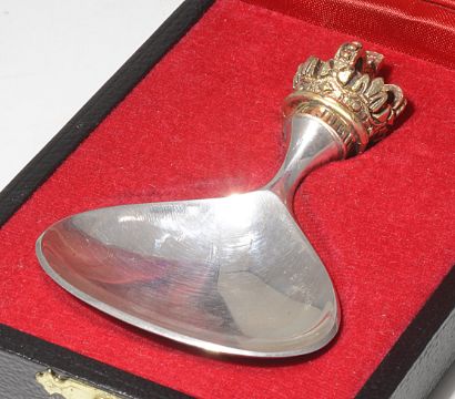 Stuart Leslie Devlin AO CMG (Australian, 1931 - 2018) A silver "Queen Elizabeth II Silver Jubilee" caddy spoon, hallmarked London 1977 the triangular bowl with the handle of Hearldic Crown, inscribed Silver Jubilee 1977, reverse engraved 'Eric Kish 8', in original case. total weight: 1.8ozt; length: 8cm approx. Condition:Good condition, engraved name to reverse of spoon bowl, little wear.