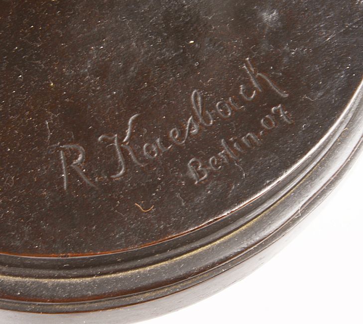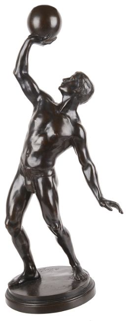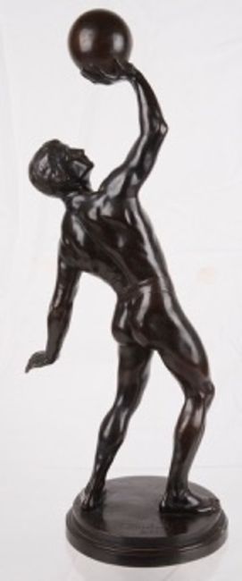 a bronze athlete holding a ball standing on a circular stepped plinth, signed R Kaesbach Berlin 07 to plinth.