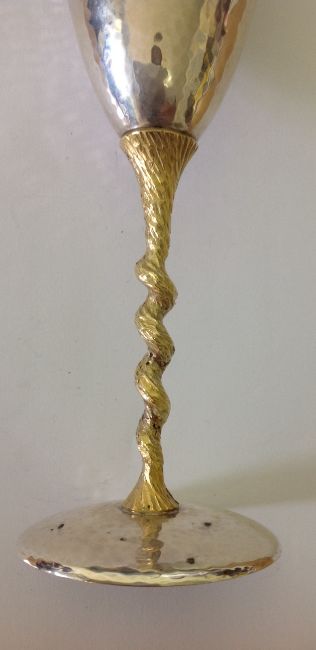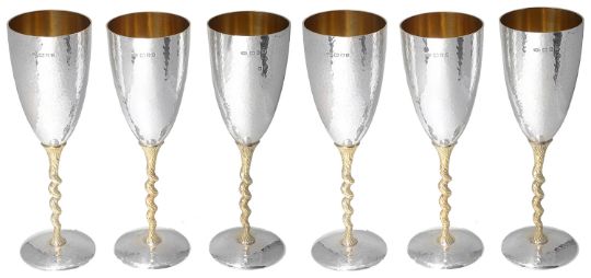 the trumpet planished bowls with gilt interior, raised upon textured twist stems with planished circular foot rings, (6).
