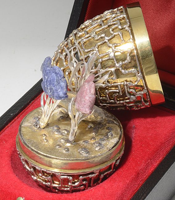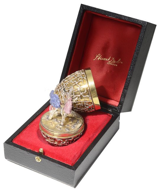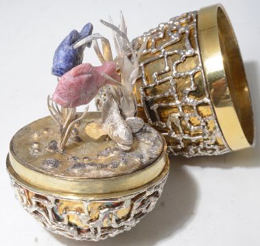 of ovoid form with applied wirework textured body, opening to reveal three fish swimming amongst reeds, in original fitted case.