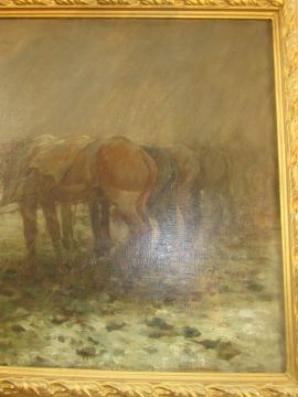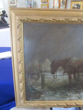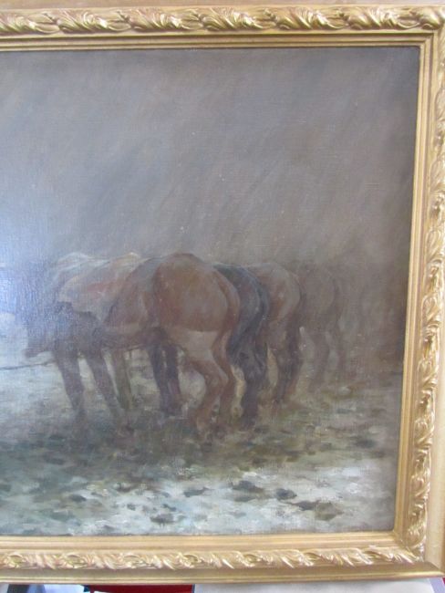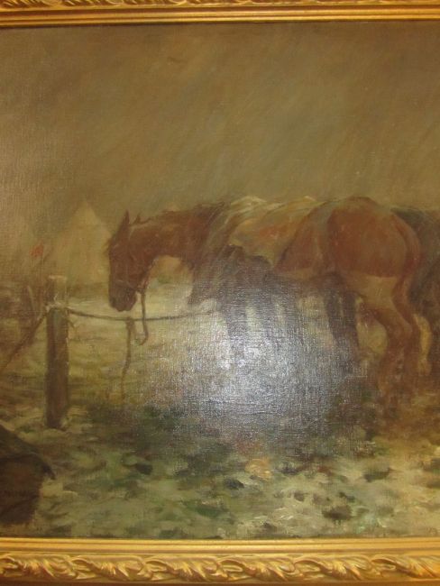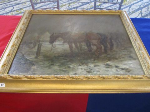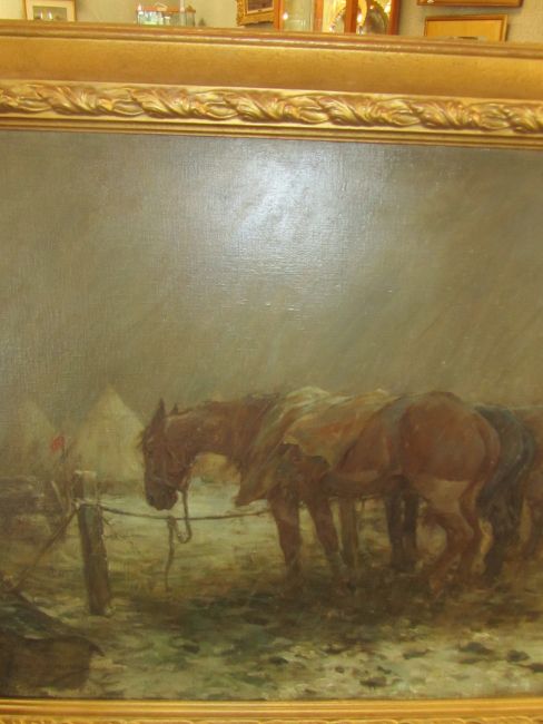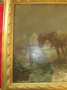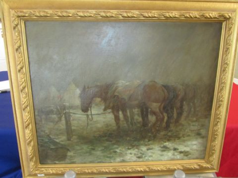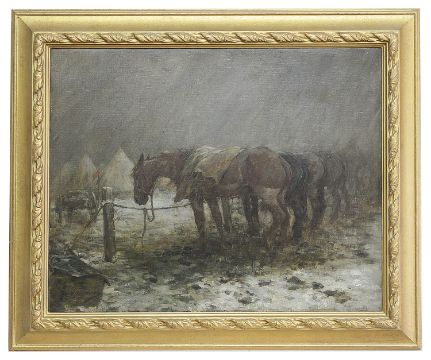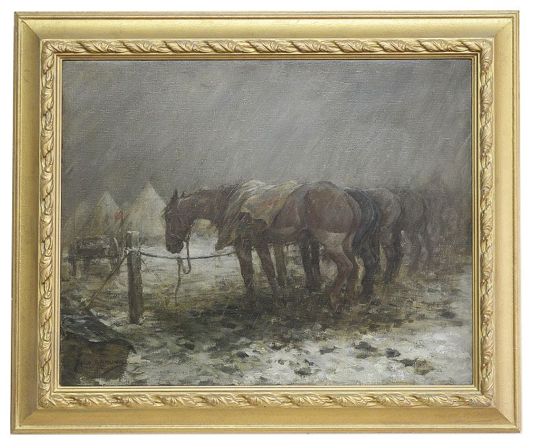 George Denholm Armour OBE (British, 1864 - 1949) "War horses resting on the Western Front", oil on canvas, signed lower left, in a gilt frame. total frame: 85 x 107cm approximately. Condition: Fair to good, with wear to frame, canvas has been relined with a stain showing on the lining at the back, brush detail can be seen on the front.