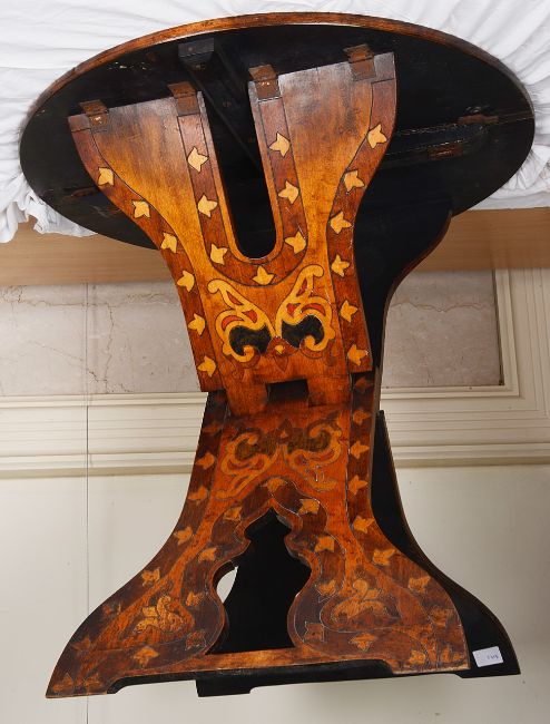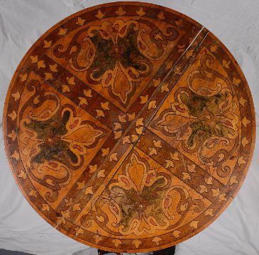Condition: Fair to good, with wear throughout, one half of the top is split, faded and with surface scratches to top and supports.