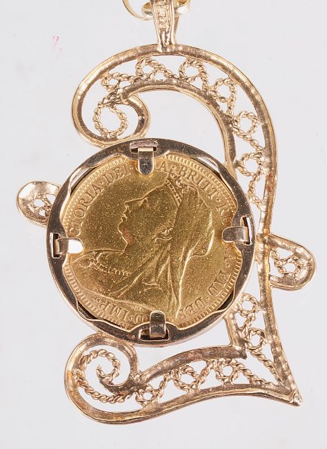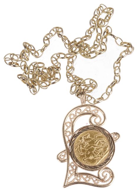 the full sovereign mounted in a 9ct gold filigree work '£' sign and suspended on a 9ct gold chain