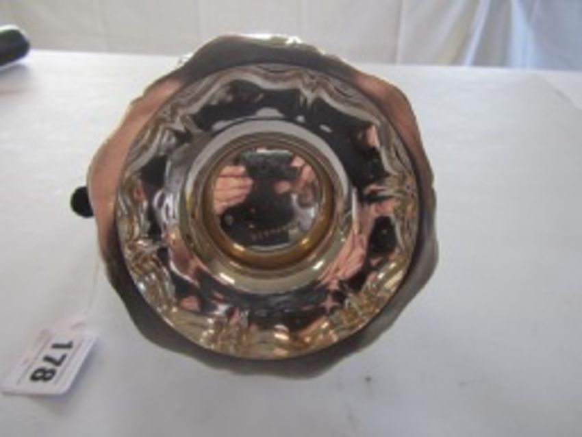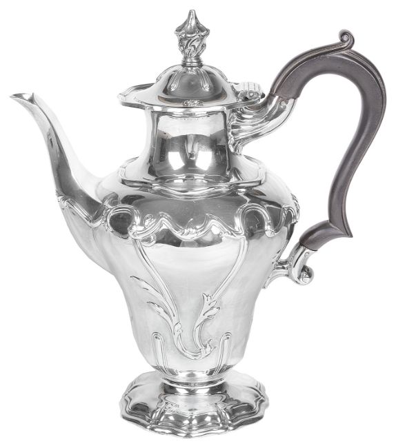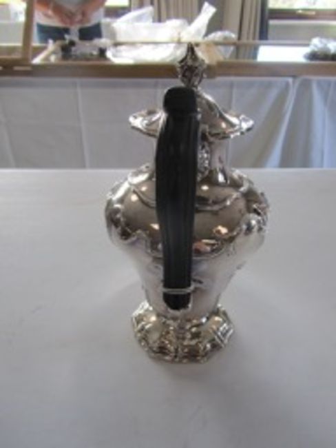 An Edwardian silver water jug, hallmarked London 1906 the lobed finial with domed hinged lid, the tapered baluster body with ebonised c-scroll handle, raised upon a stepped foot ring, by Walter & Charles Sissons, RD No. 476822. weight: 19ozt; height: 23cm approximately. Condition: Fair to good, little wear to body, no apparent splits or dents.
