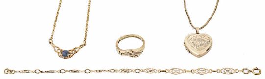 comprising a hinged heart shaped picture locket on woven gold chain, a single stone sapphire set gold stylised necklace, a delicate pierced bracelet and a pierced gold dress ring (4)