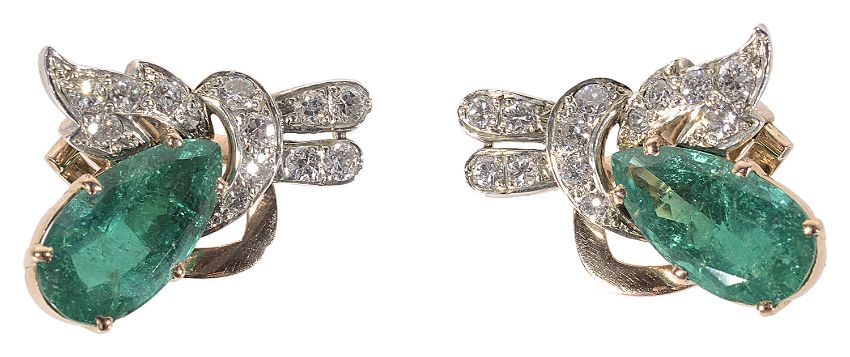 A pair of fine Continental emerald and diamond ear clips of foliate scroll form