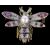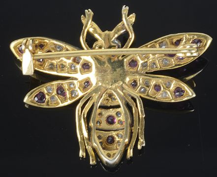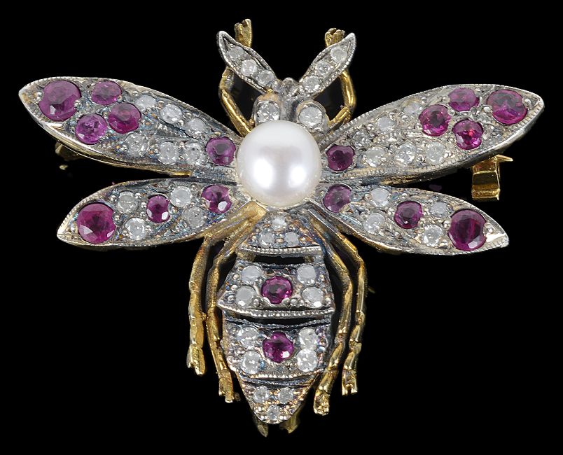 the sectioned thorax set with diamonds with central cultured pearl, the diamond set wings with ruby set tips and diamond set antennae and eyes, yellow metal mount testing for gold