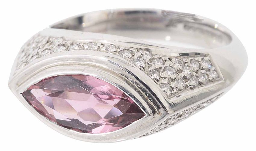 the 18ct white gold mount set with a marquis shaped pink tourmaline and set in a fancy pave diamond set raised mount, fully marked and signed