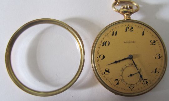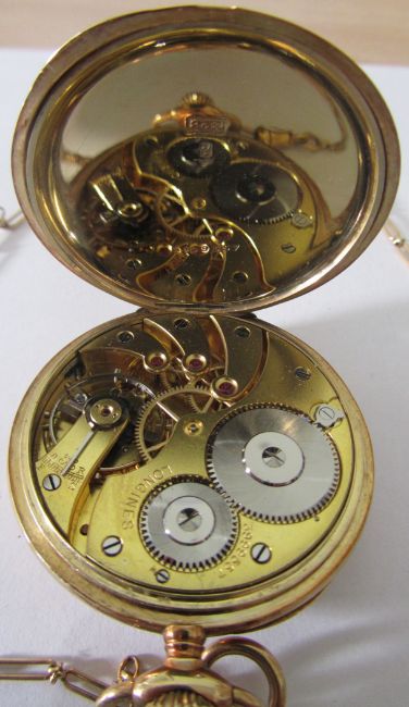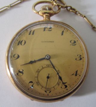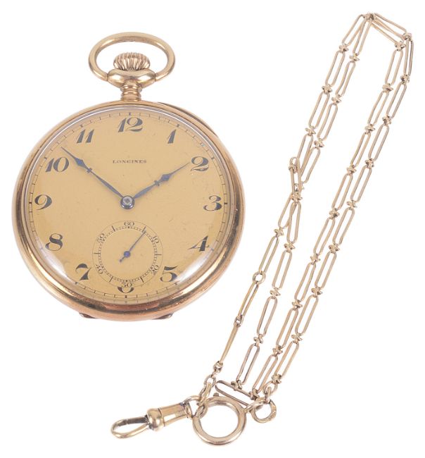 A 14k gold Longines open faced pocket watch with watch chaina gilt dial with Arabic hours, spade hands and subsidiary seconds, in a engine turned case, case and movement numbered: 3999557, with a yellow metal fancy, bears mark, engraved to case back 20 -12-1926, (2)total weight: 74.10gms; case diameter: 46mm; dial diameter: 40mm; length of chain: 41.7cm; weight of chain: 6.93gms approximately.Condition: Fair to good, with wear to dial and plexi glass, mechanism NOT tested, running at time of cataloguing, hallmarks on chain rubbed.
