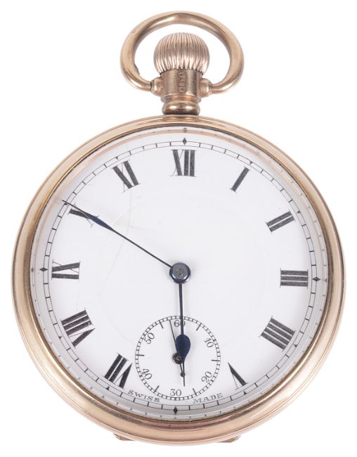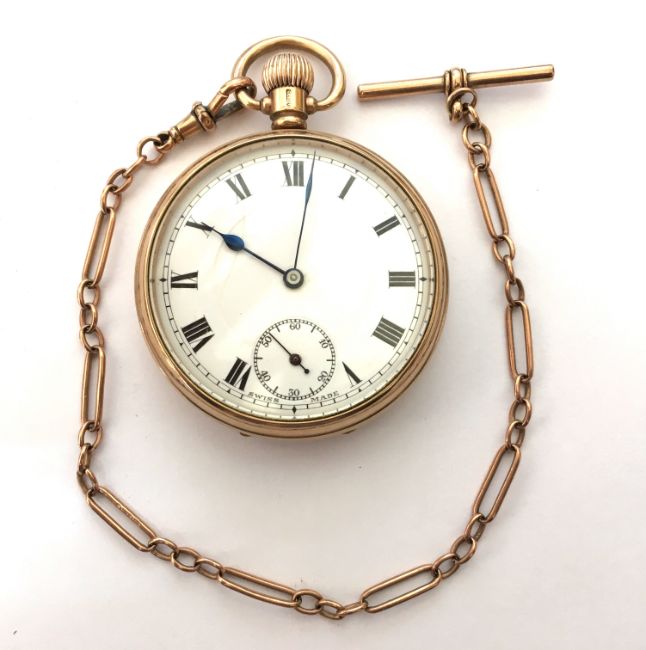the white dial with Roman hours, spade hands and subsidiary seconds dial, case number: 10170; the link chain with t-bar, hallmarked 9ct, (2)