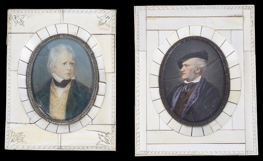 the first of a scholarly gentleman wearing a hat, signed on right side, Stiele?, mounted in an ivory frame, with paper back; the second of a gentleman wearing a floral waistcoat, mounted in an ivory frame, (2)