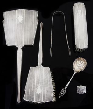 An Art Deco three piece silver dressing table brushes and mirror, hallmarked Birmingham 1948 by Daniel Manufacturing Company, together with Victorian silver sugar nips, hallmarked London 1838 by Joseph & Albert Savory; a Victorian silver jam spoon, hallmarked London 1892 by GM and a silver pill box, of small rectangular form with foliate decoration, hallmarked Sterling 925, (6)