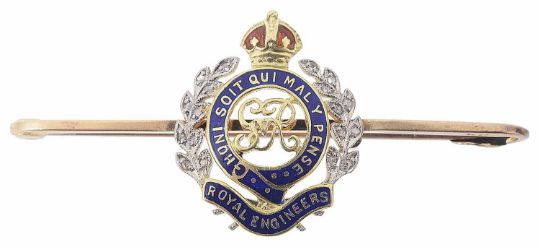 A diamond set rose gold Royal Engineers enamelled sweetheart pin