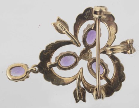 An attractive Edwardian style amethyst and seed pearl pendant brooch on fancy chain