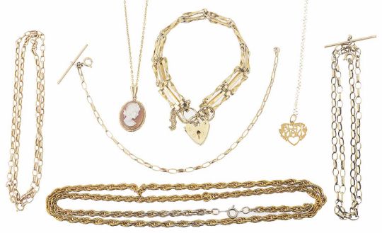 comprising 9ct yellow gold belcher link Albert necklace with t-bar and matching bracelet; a 9kt yellow gold belcher link necklace; a 9ct gold cameo pendant with fine link chain; a 9ct gold fine link necklace with Special Gran pendant; a gilt metal rope twist necklace and a gilt metal gate bracelet, (7)