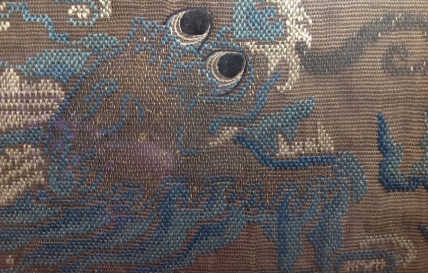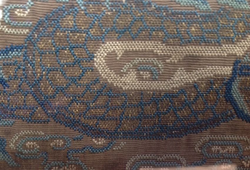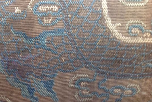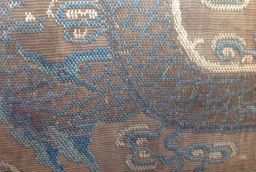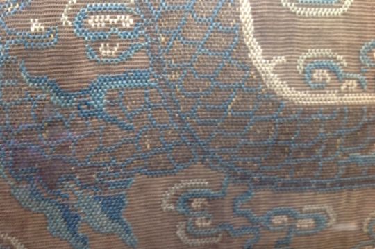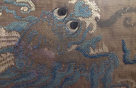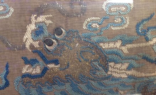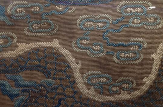 each panel embroidered with a dragon among cloud scrolls chasing the flaming pearl, framed, (2)