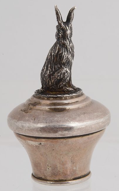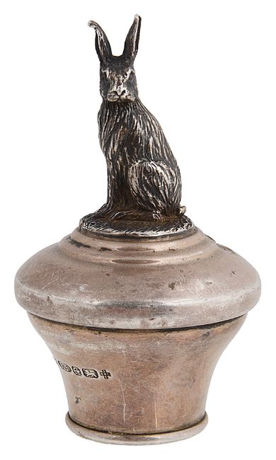 modelled as a seated hare on a tapered stopper, cork filled, hallmarked H & H