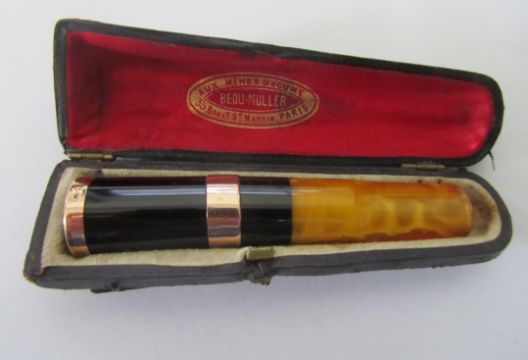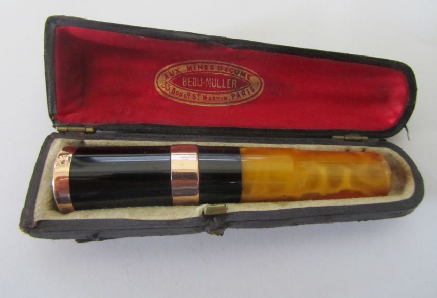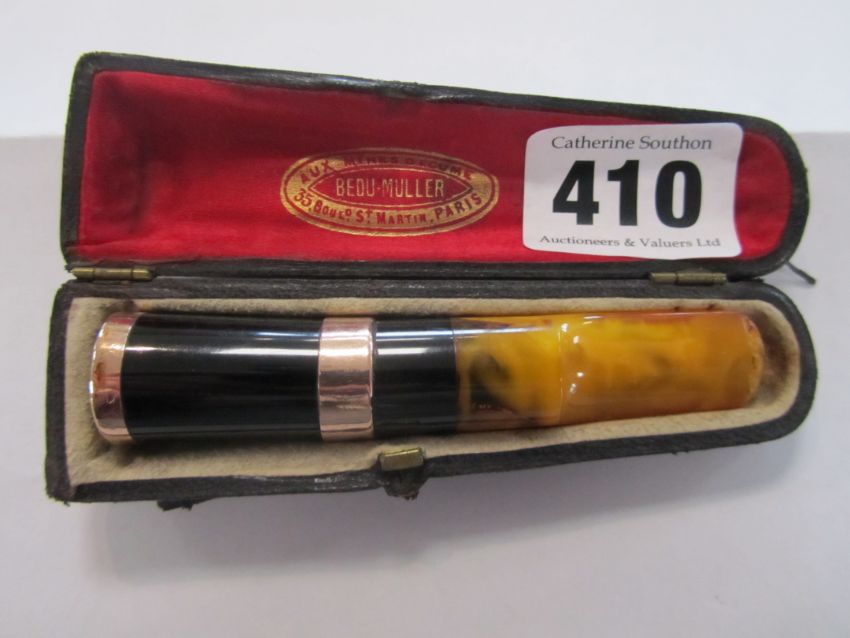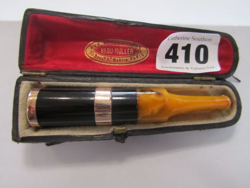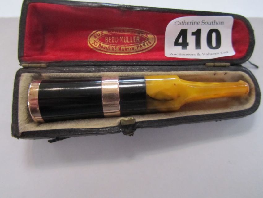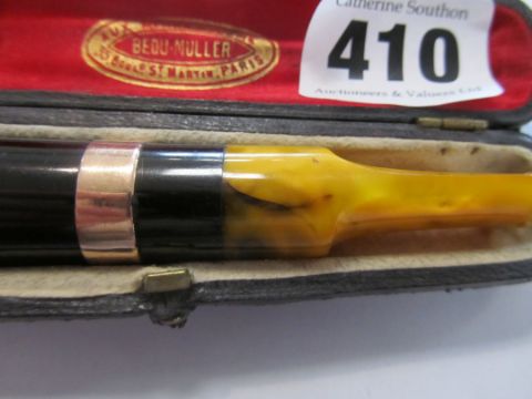 of typical form with amber mouthpiece above bands of Bakelite and gold, bears eagle hallmark, in a fitted box with Bedu Muller Paris logo