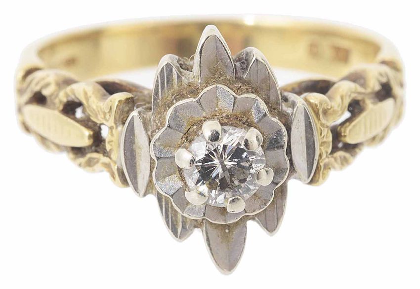 the diamond set in yellow and white 18ct gold textured fancy setting, circa 1980